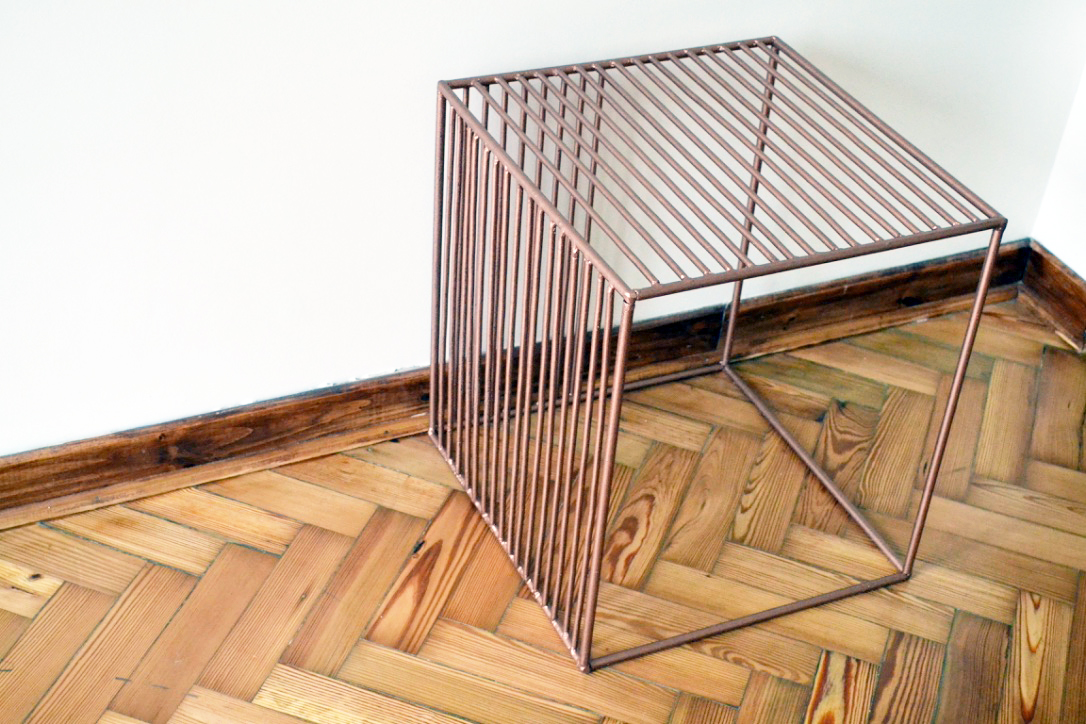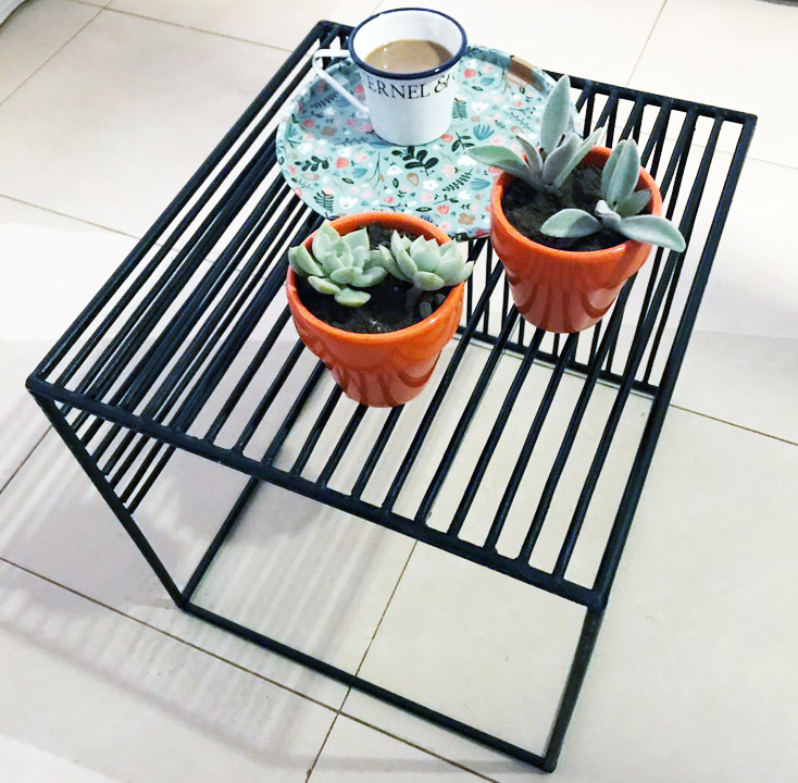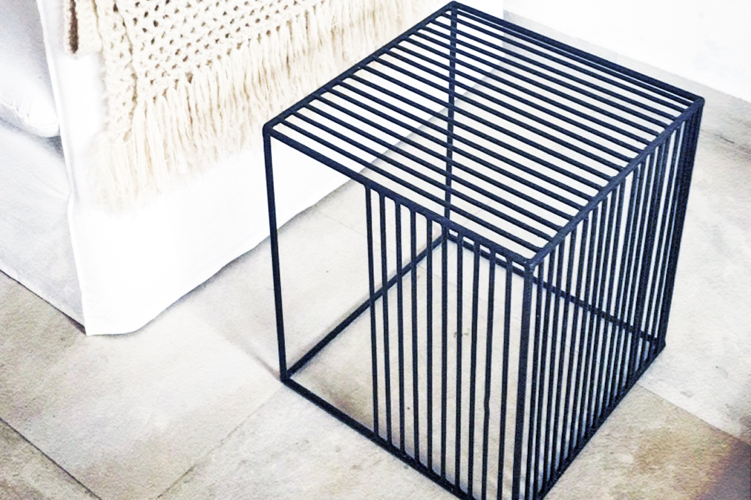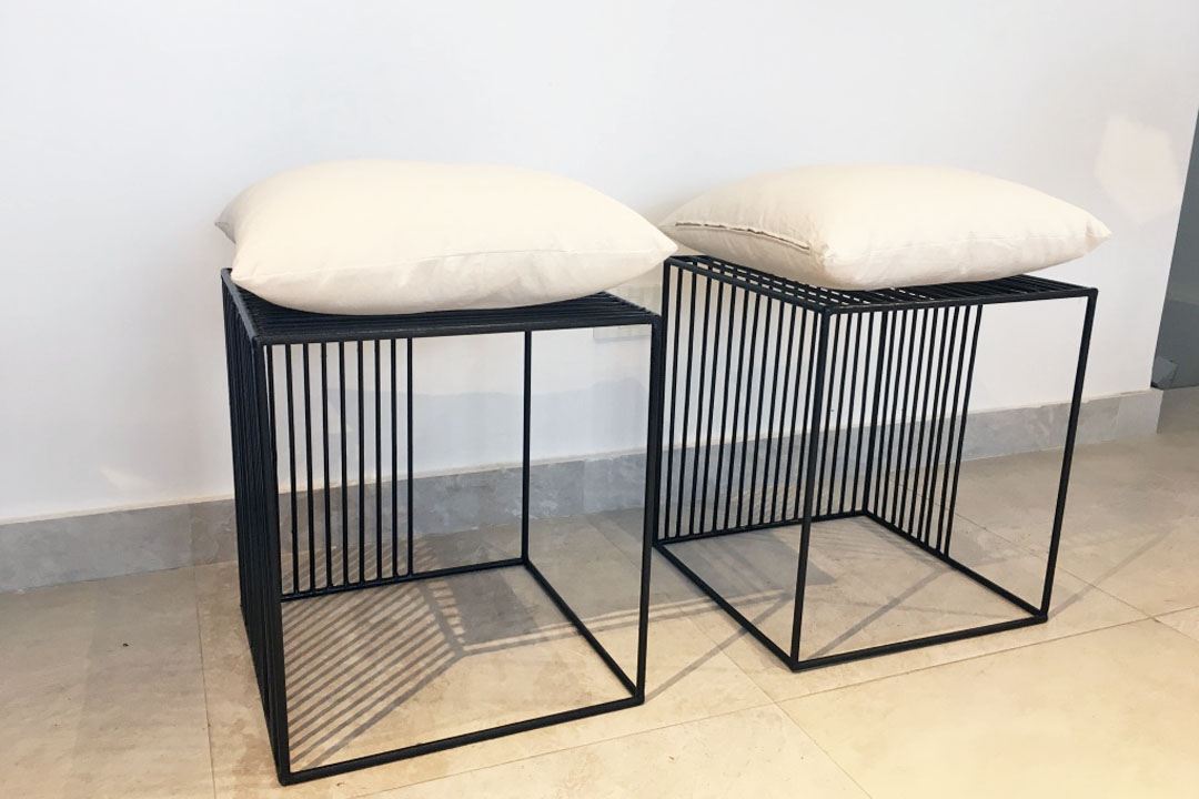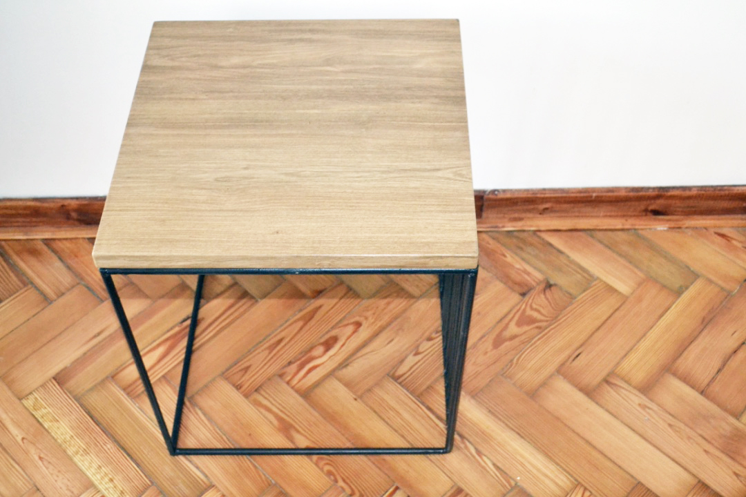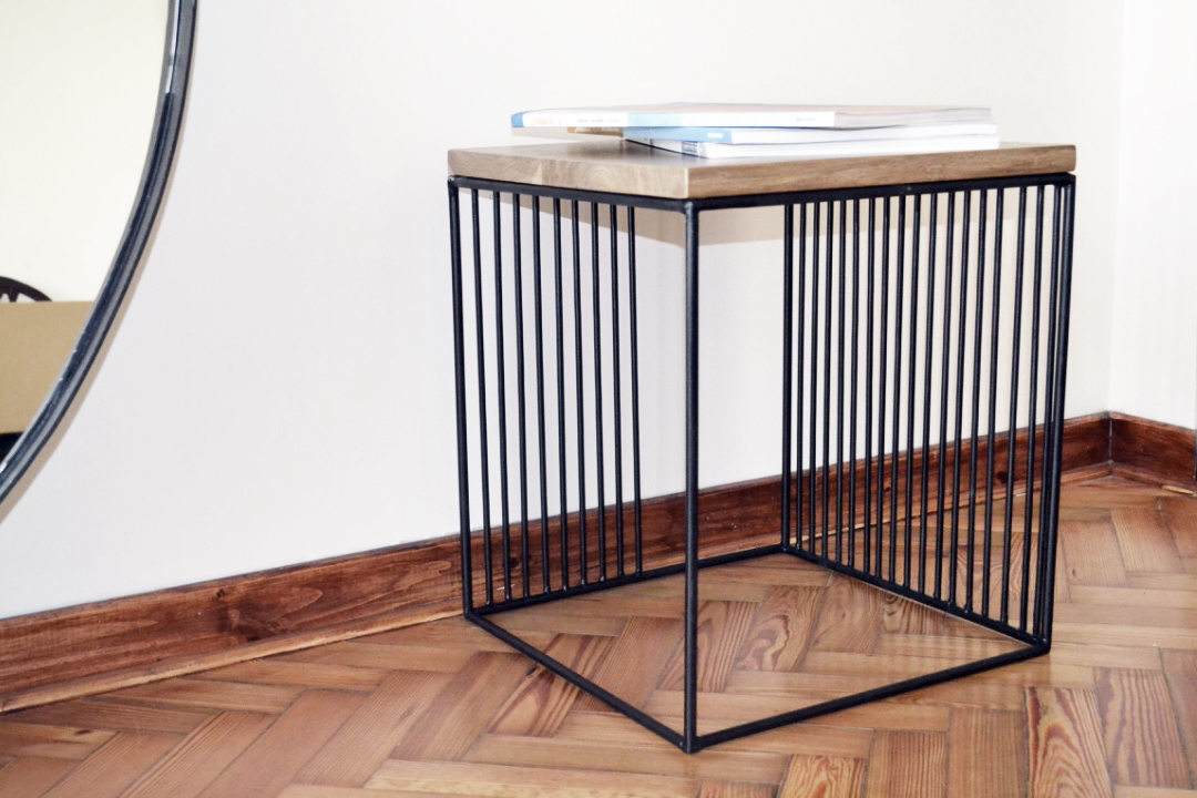Mesa cuadrada con estructura de tubos de hierro y tapa de tubos de hierro, madera maciza o mármol. Medidas: 0,45 x 0,40 x 0,40 mts. Se realiza en distintas maderas y terminaciones. Se puede utilizar como taburete colocando un almohadón.