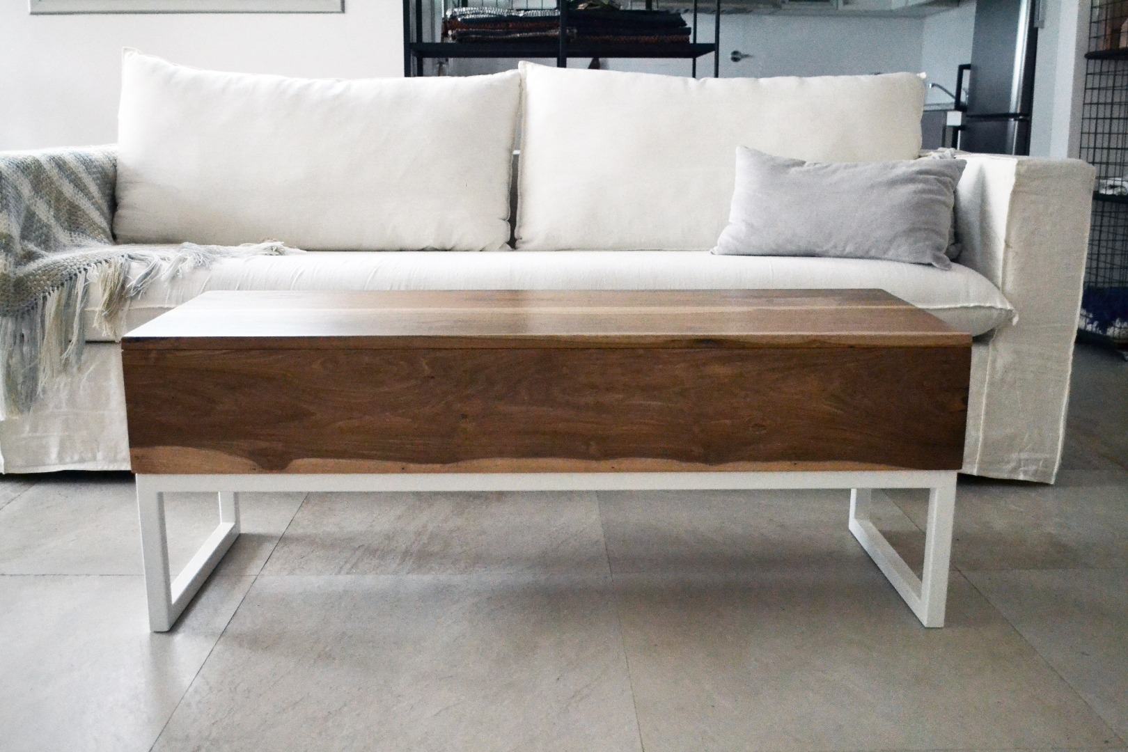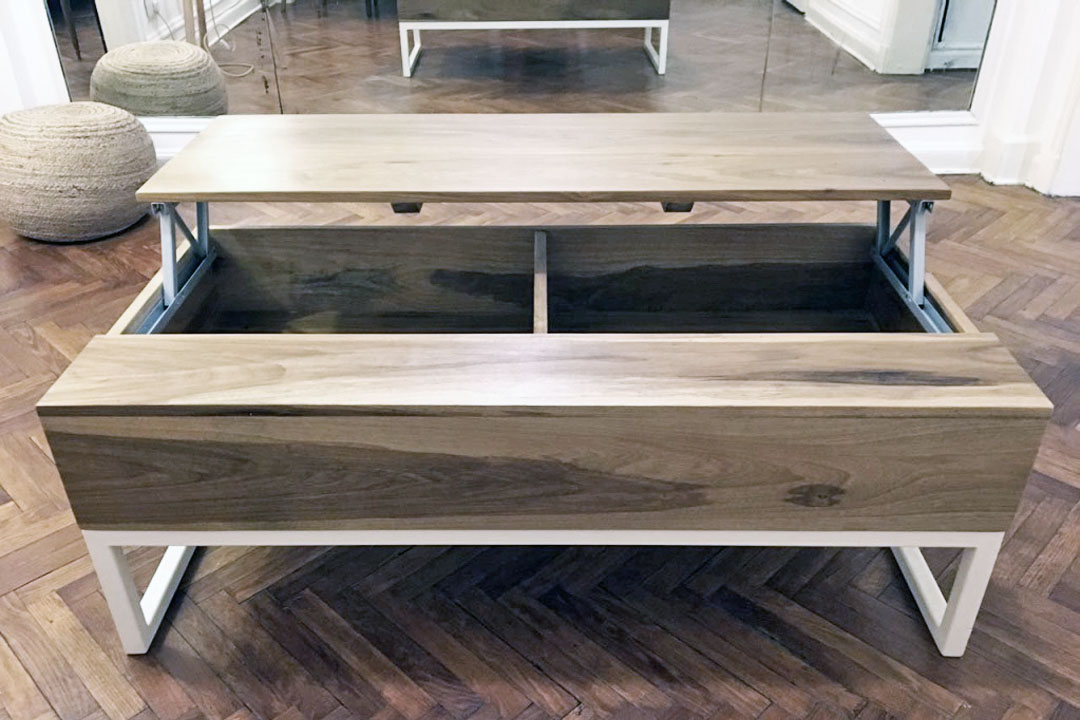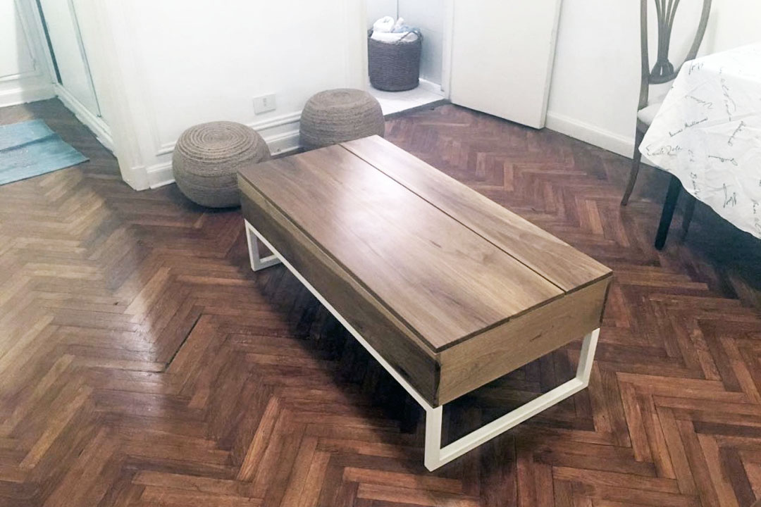 Mesa rebatible con estructura de hierro y caja en madera maciza o laqueada. Medidas: 0,45x1,20x0,60 mts. Se realiza a medida y en distintas maderas y terminaciones.