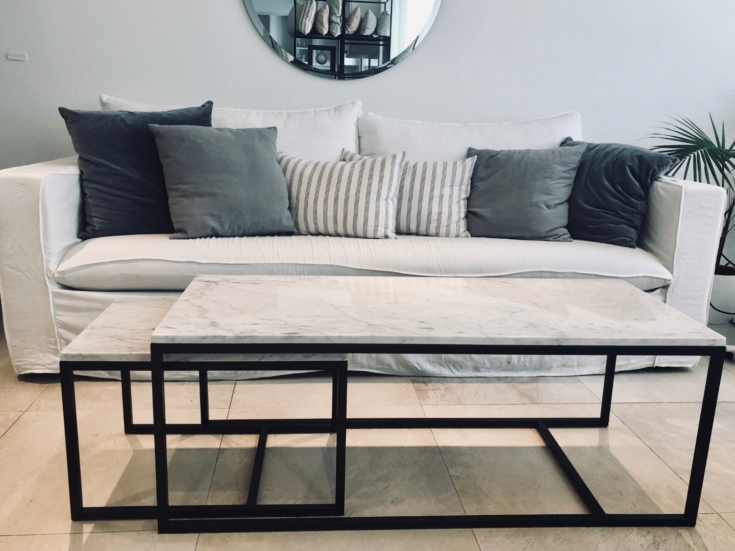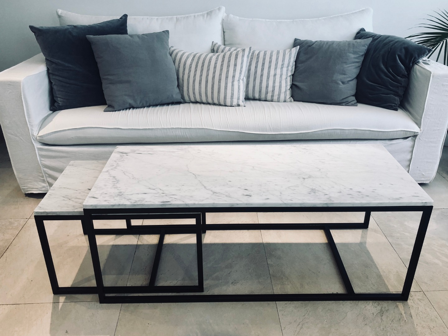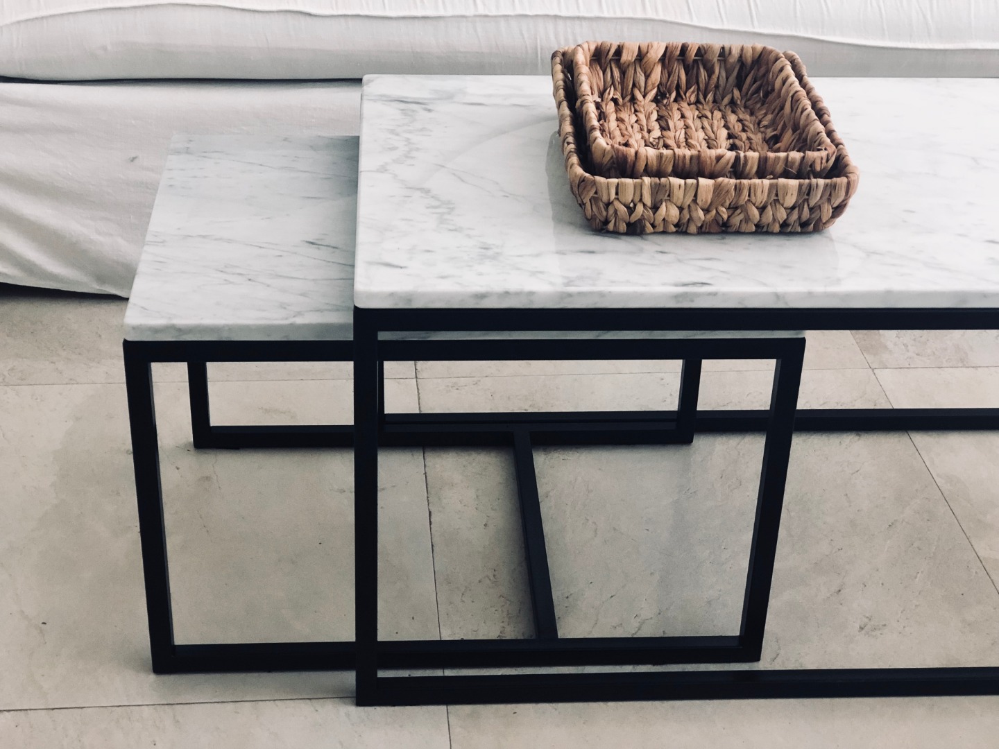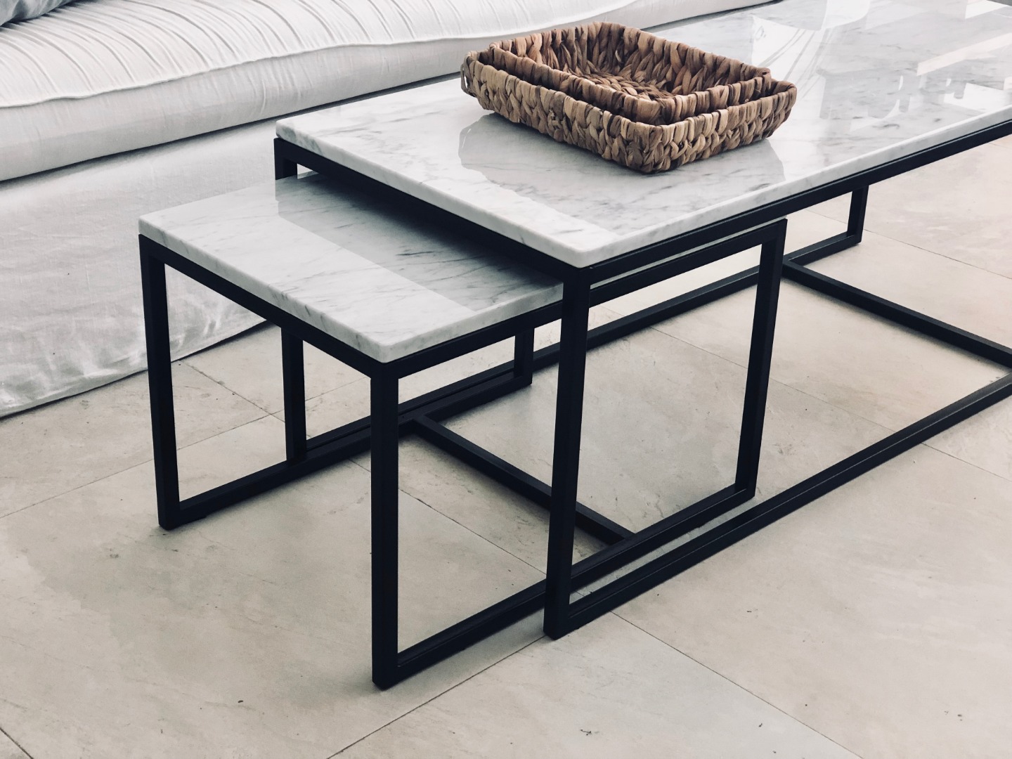 Mesa con estructura de hierro y tapa de mármol, madera, chapa, vidrio o espejo. Se realiza a medida y en distintos colores.