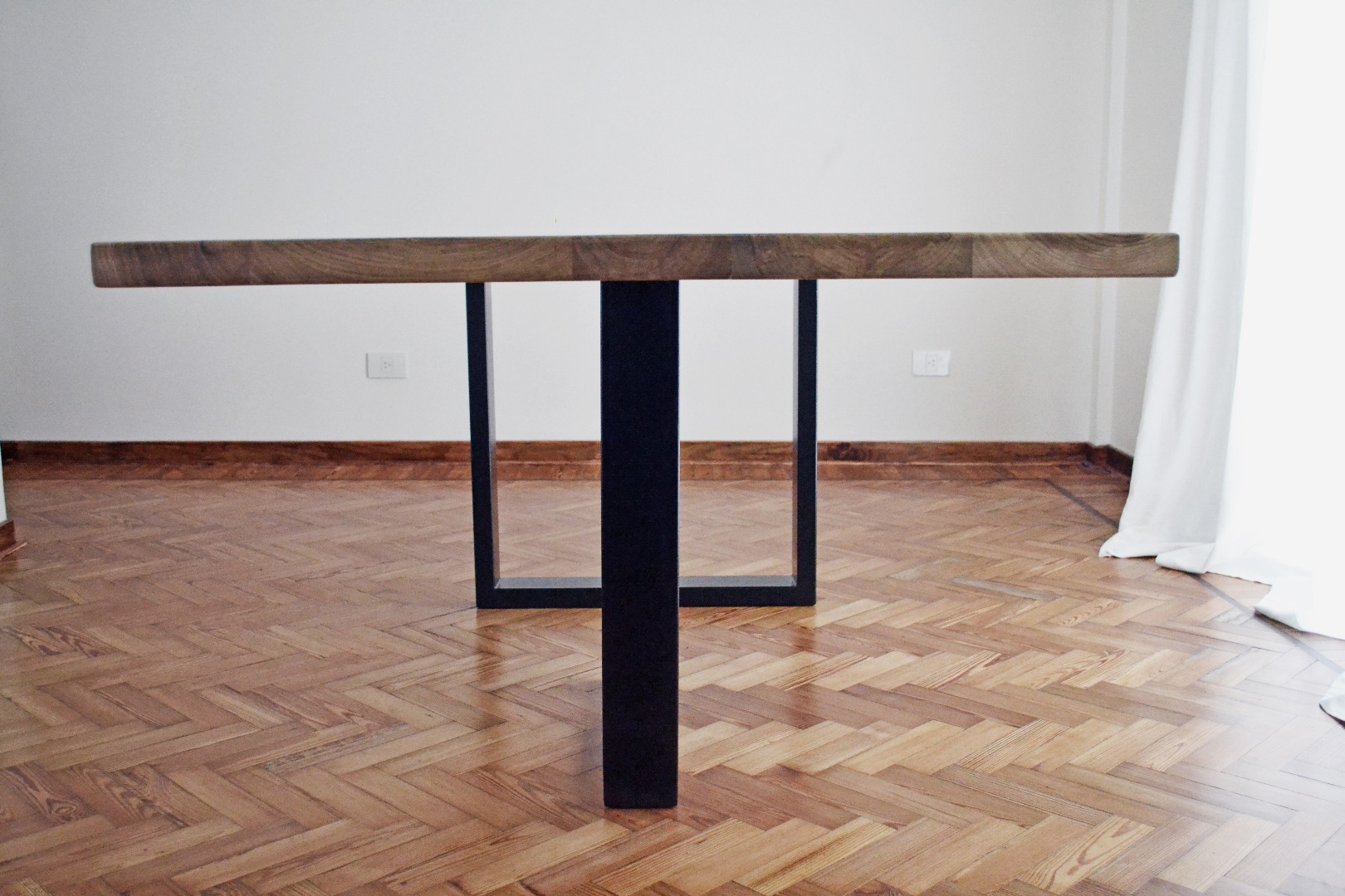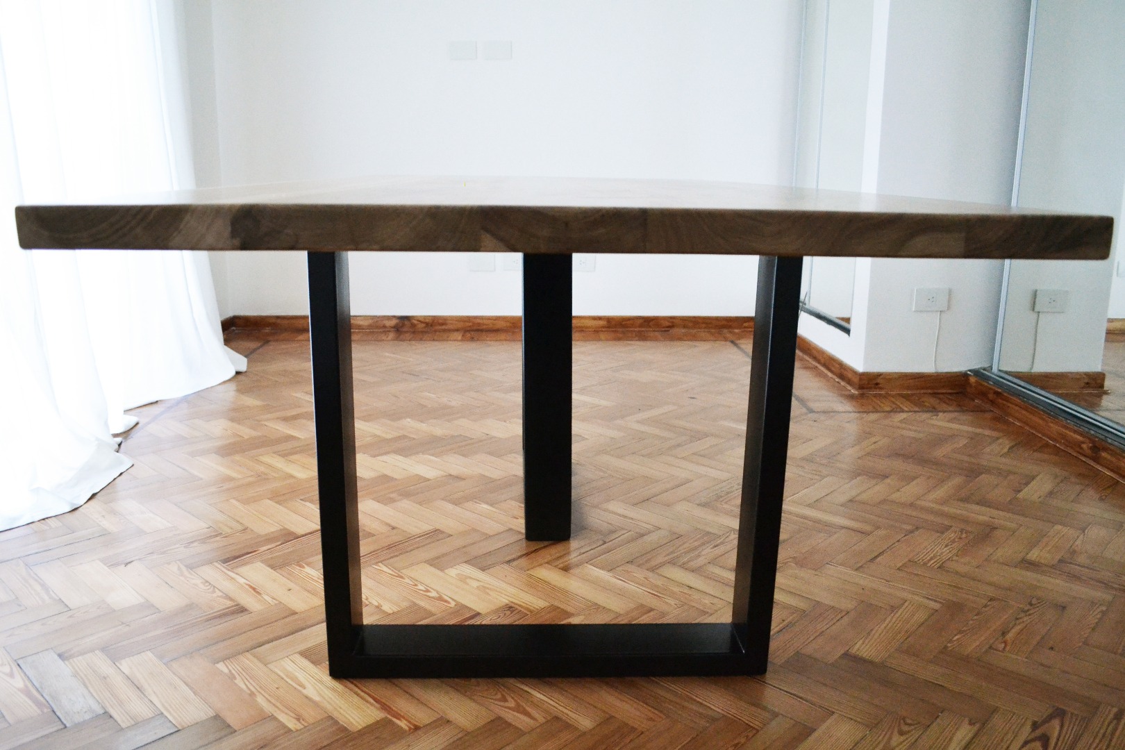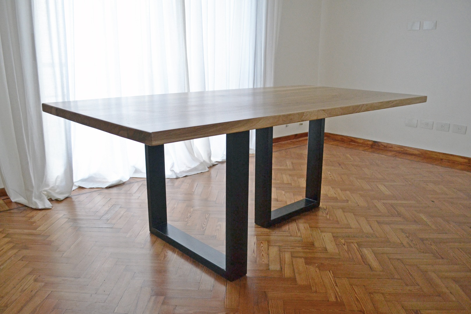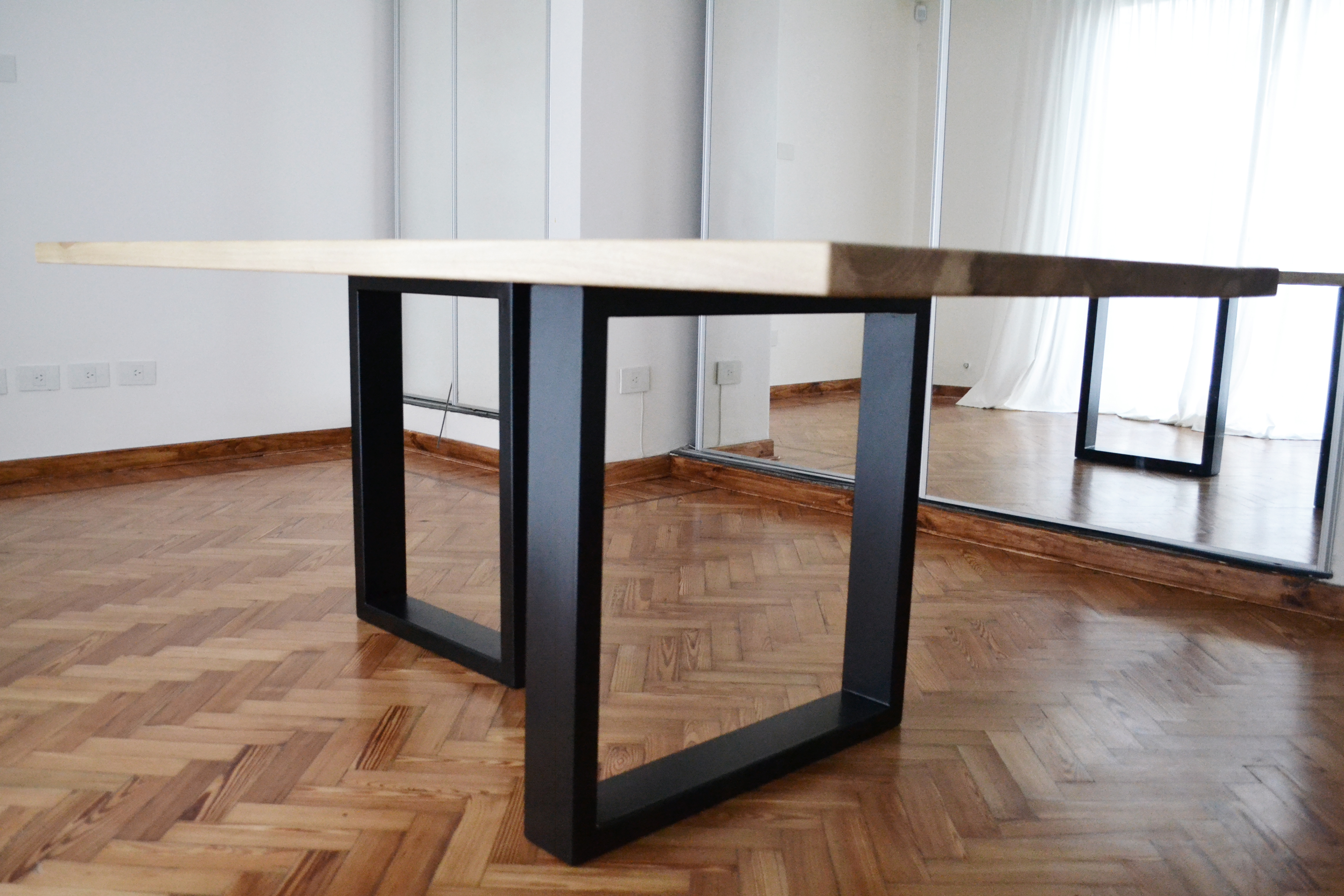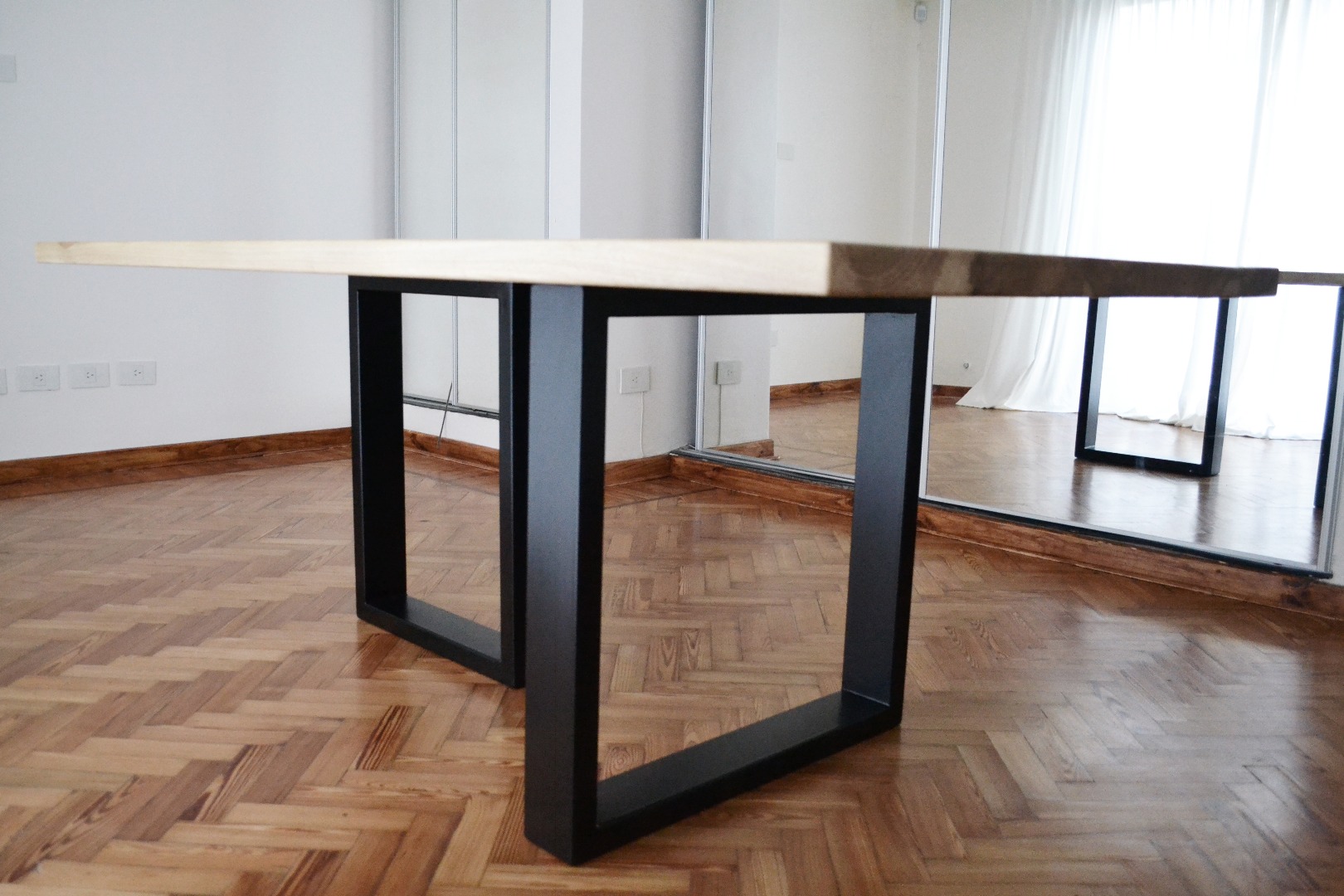 Mesa con estructura de hierro con pintura epoxi microtexturada y tapa de madera maciza, vidrio laminado o mármol. Se realiza a medida y en distintas maderas y terminaciones.