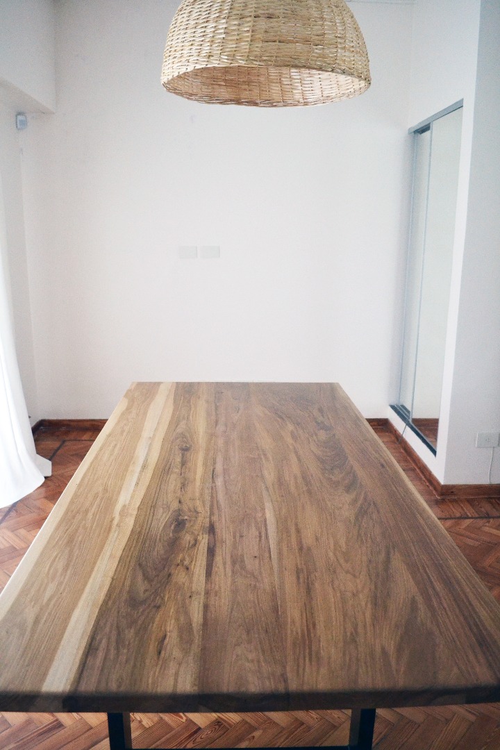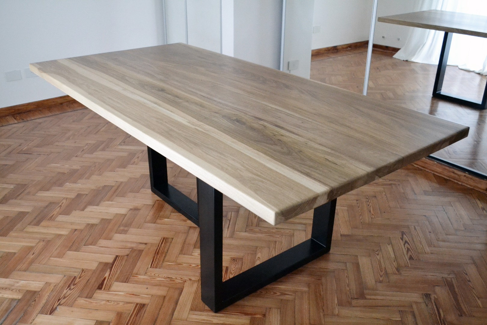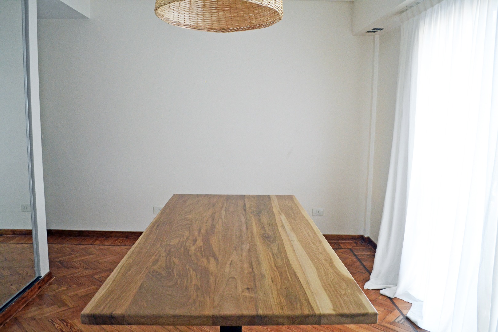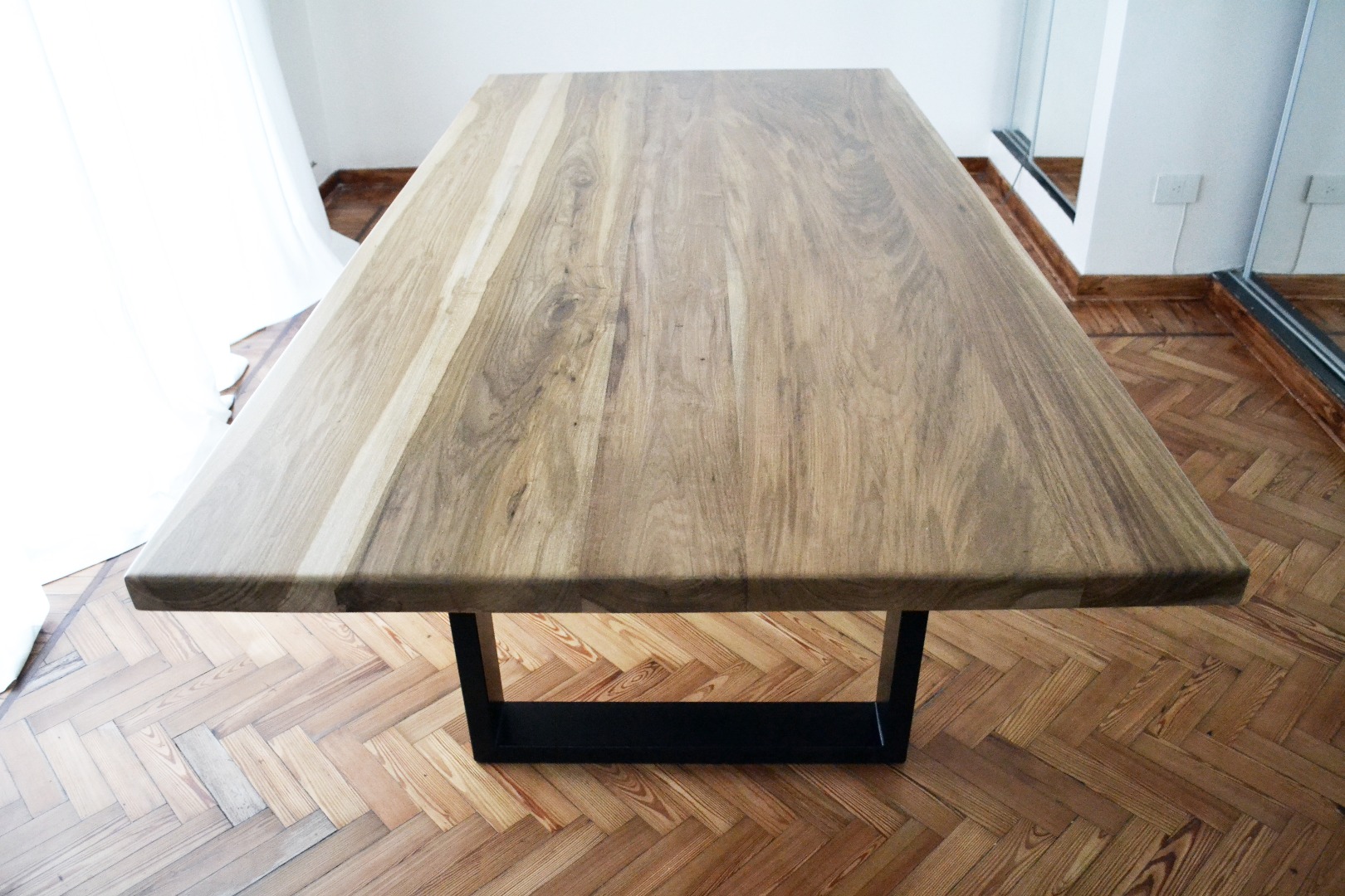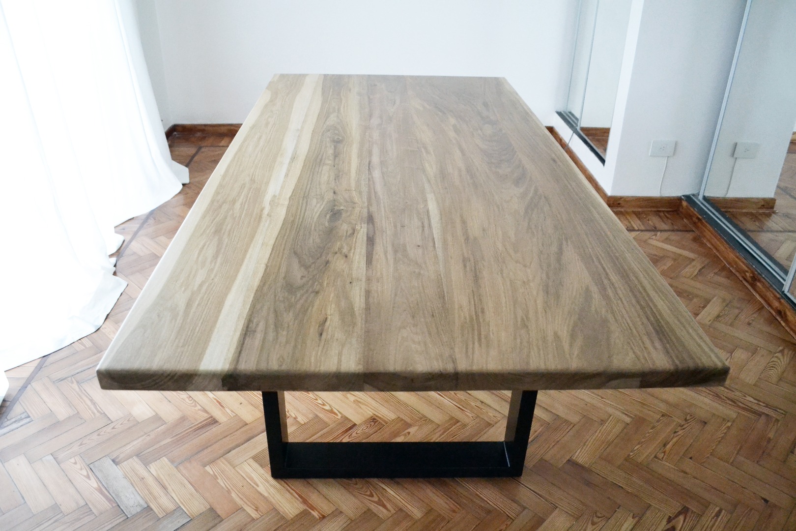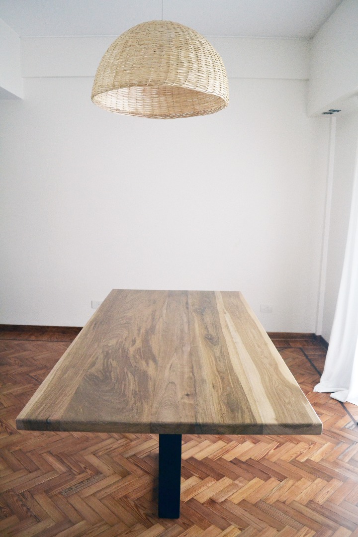 Mesa con estructura de hierro con pintura epoxi microtexturada y tapa de madera maciza, vidrio laminado o mármol. Se realiza a medida y en distintas maderas y terminaciones.