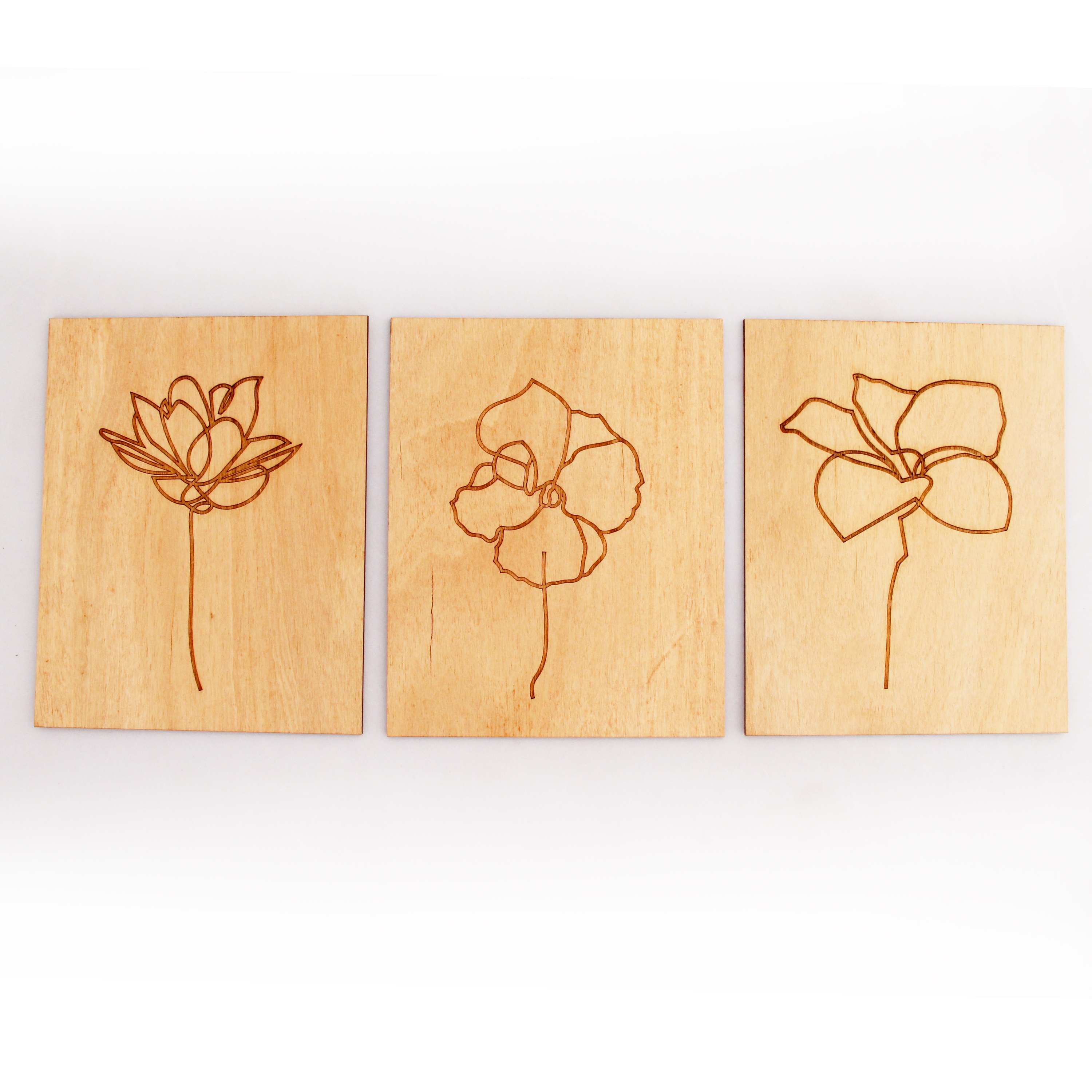 Set de tres cuadros de terciado de Guatambu. Medidas 20x16 cms.
