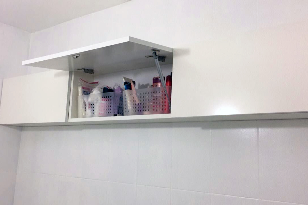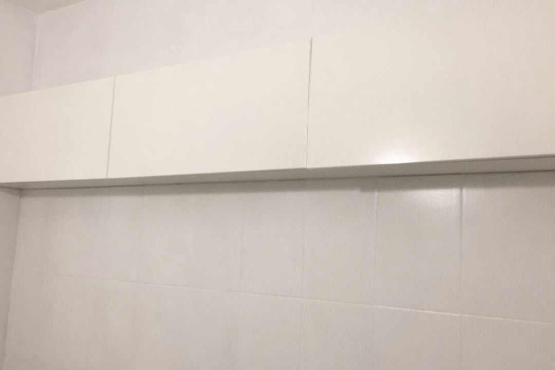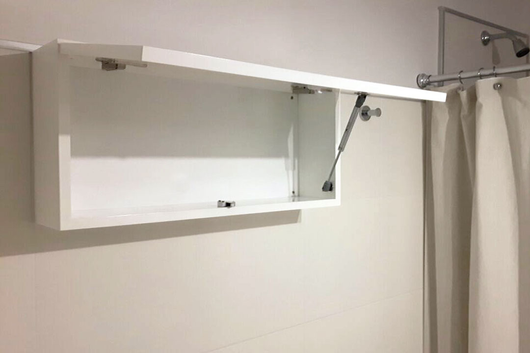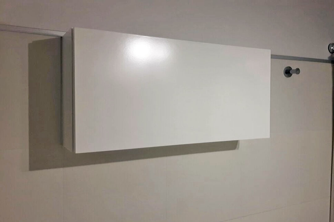 Estante de madera o laqueado colgante con puerta/s con sistema de abrir push. Se realiza a medida y en distintas maderas y terminaciones.